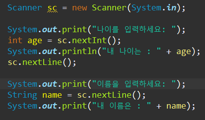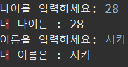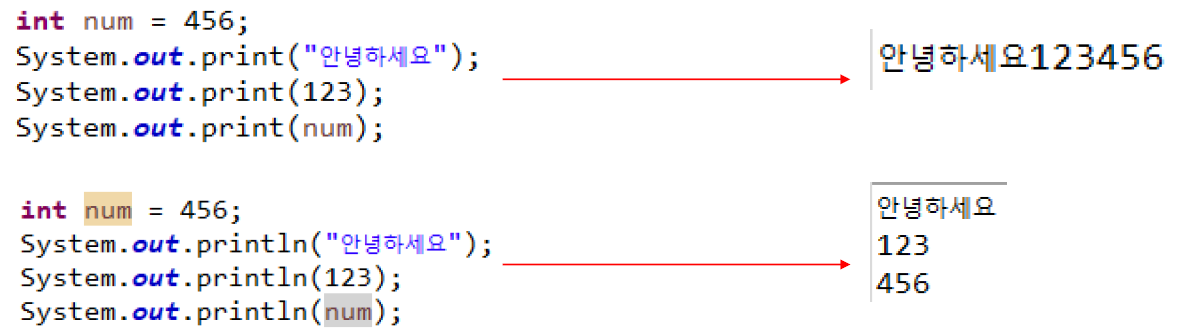 괄호 () 안의 내용을 출력 . 개행 문자(줄 바꿈) 포함되지 않음