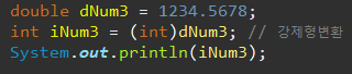 출력시 1234 나옴 ( 범위가 큰 자료형에서 작은 자료형으로 강제로 변환하여 데이터 손실 발생