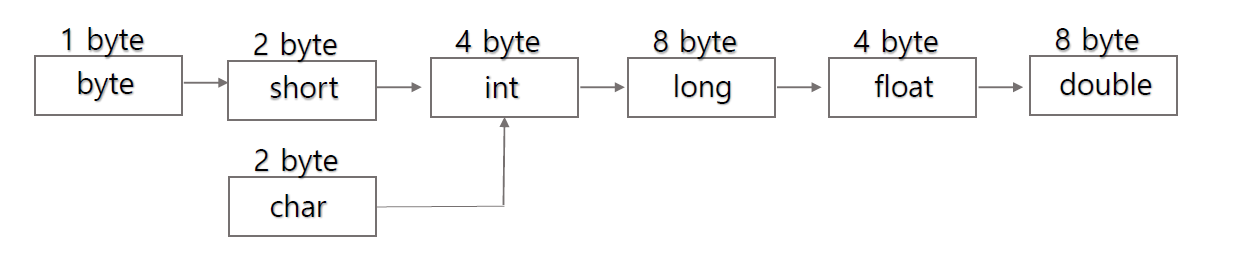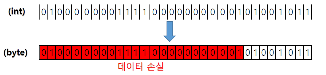 형변환은 크기가 작은 타입이 큰 타입에 저장되어야 데이터 손실이 발생하지 않는다.