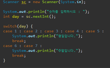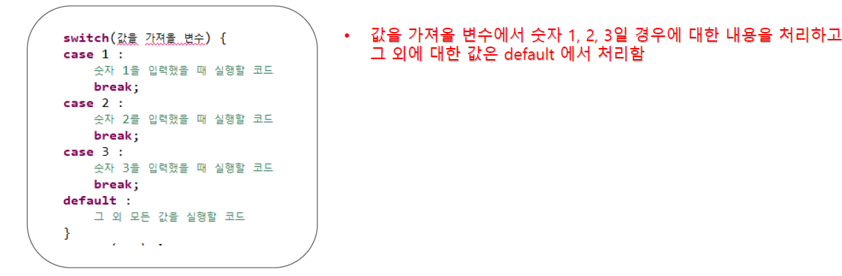 •swich문 : 특정 숫자, 문자에 대한 값을 받을 때 주로 사용함