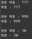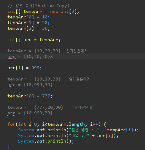 배열의 주소 값만 가져와 참조하는 방식으로, 하나의 배열 객체를 두 변수가 공유함