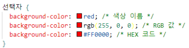 배경의 색상을 지정하며 색상 이름이나 RGB값, HEX코드 등을 사용하여 지정 가능