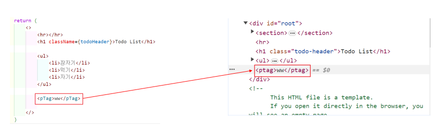 태그명은 문자열로 인식될 수 있음: JSX 내에서 문자열을 사용해 태그명을 작성할 경우, 태그가 아닌 단순 문자열로 처리될 수 있습니다.