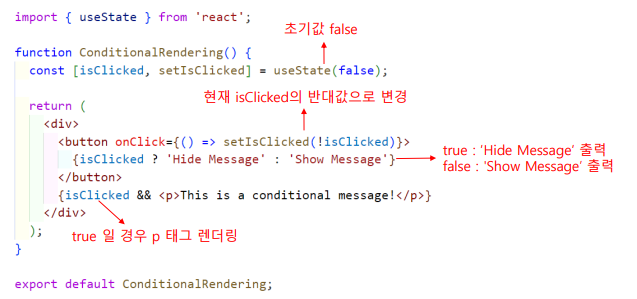 State는 조건부 렌더링과 함께 사용할 수 있습니다. 예를 들어,