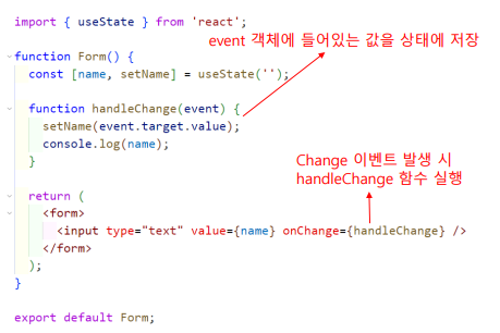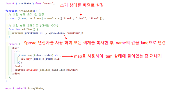 - 상태 변수와 상태 변경 함수 생성: useState를 사용해 상태를 생성하고, 상태를 변경하는 함수를 설정합니다.