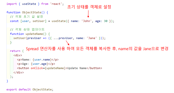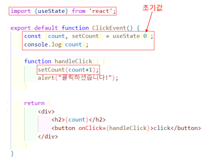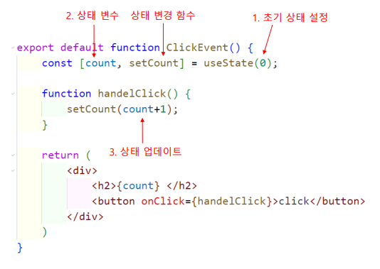 - 상태 업데이트: 상태 변경 함수를 호출하여 값을 업데이트하고 리렌더링을 유도합니다.
