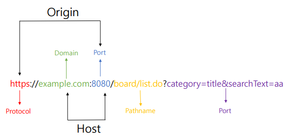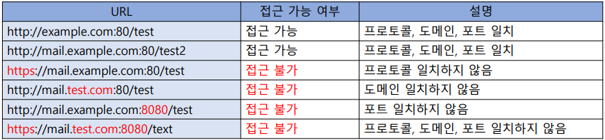 교차 출처 리소스 공유의 뜻을 가지며 출처를 구성하는 Protocol, Domain(Hostname), Port 중 한가지라도 다르면 브라우저가 보안상의 이유로 CORS 에러를 발생시킴