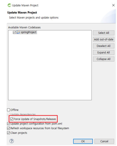 3. Force Update를 체크하고 OK 버튼 클릭.